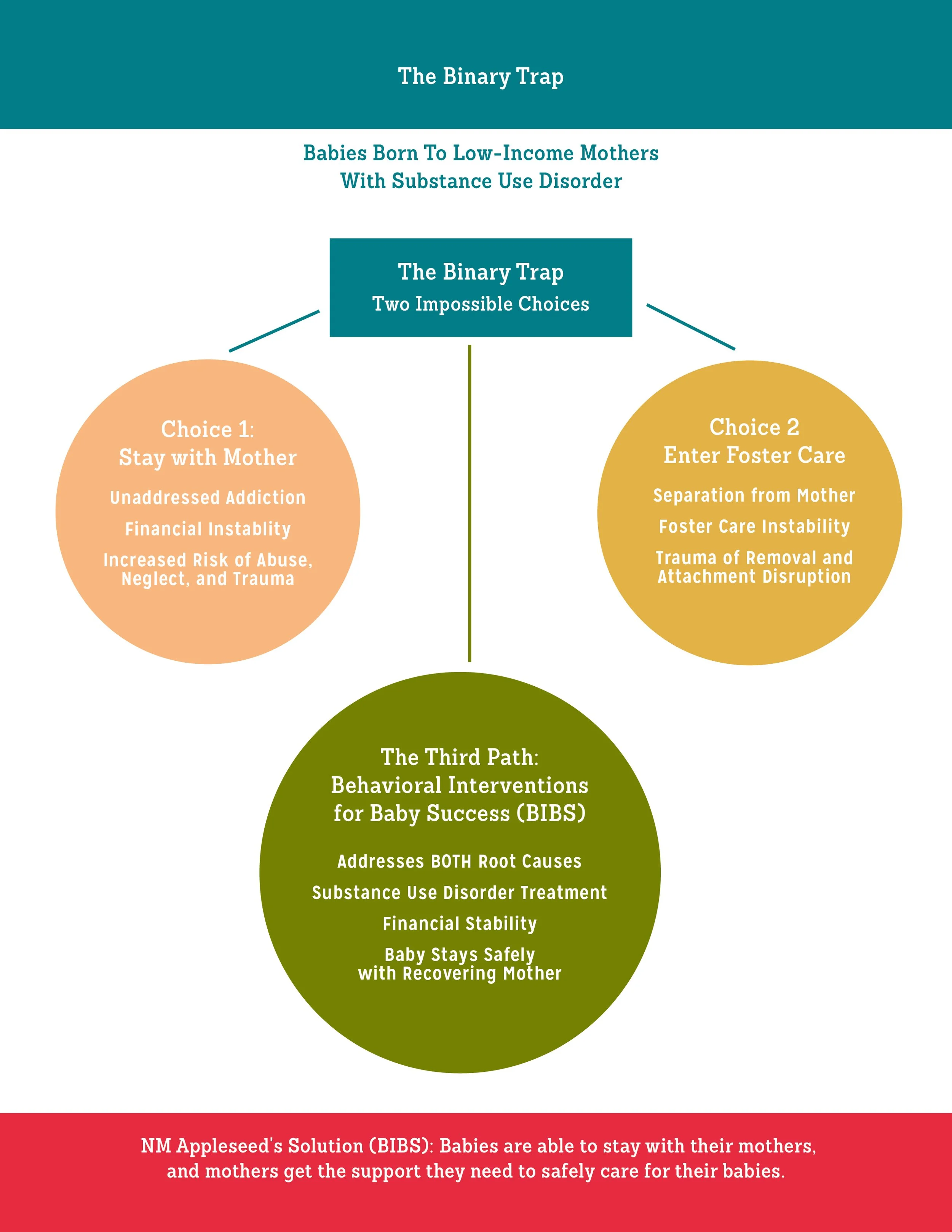 BIBS solves the binary trap of having to choose between baby being removed to foster care because of mom's use or staying with mom and risking increased abuse or neglect because of her use. BIBS addresses both the addiction and the poverty risk factors for moms early in pregnancy to increase the likelihood of healthy moms and baby staying together.