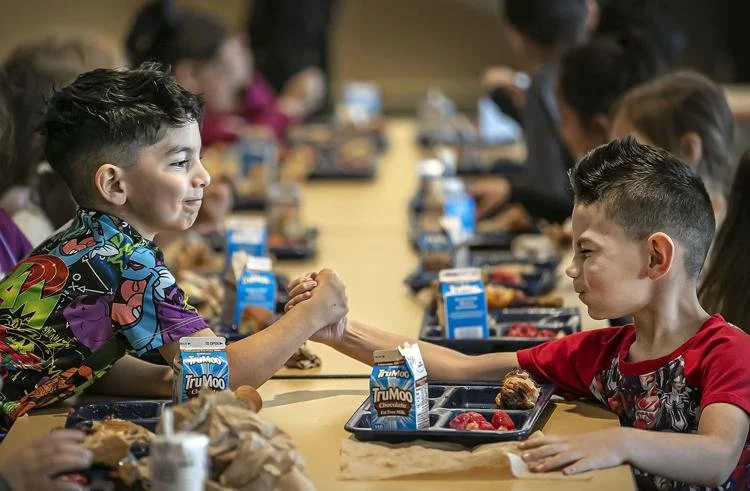 First graders Nevin Dominguez, left, and Liam Griego arm wrestle Jan. 25 during lunch at Nina Otero Community School. Legislators are looking to resurrect the free school meals program for all New Mexico students.