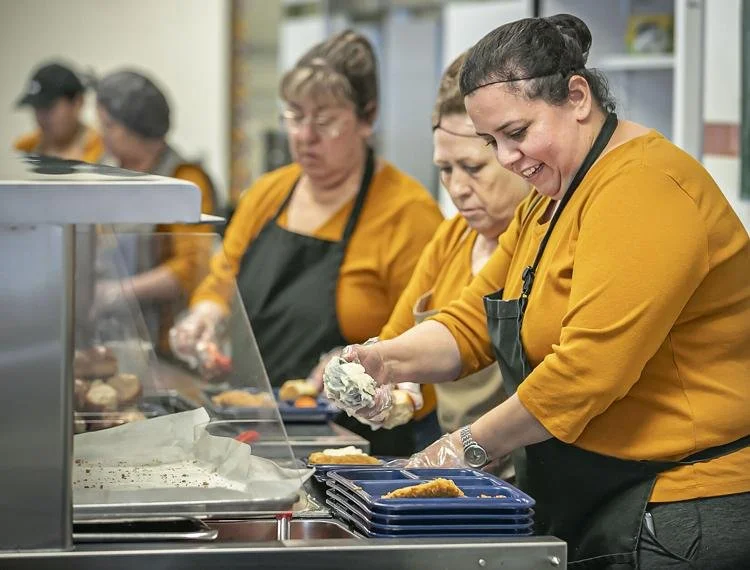 From right, cafeteria workers Bertha Gonzalez, Luz Terrazas and Aracely Landeros dole out the day’s fare consisting of chicken drumsticks, mashed potatoes, carrots and fruit during lunch at Nina Otero Community School on Jan. 25.