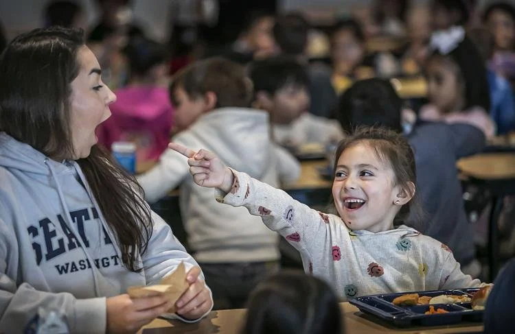 Kindergartner Myalee Romero jokes with teaching assistant Allyson Anaya on Jan. 25 during lunch at Nina Otero Community School. One in five New Mexico children face food insecurity, according to the Albuquerque-based nonprofit New Mexico Voices for Children.